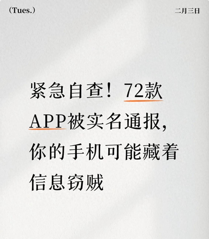 2026年2月3日,国家网络安全通报中心抛出一颗“重磅炸弹”:经国家计算机病毒应急处理中心技术检测+实地核查双重验证,72款移动应用(含微信、支付宝小程序)因违法违规收集使用个人信息被实名点名通报!更让人揪心的是,这些涉事应用覆盖社交、外卖、教育、金融、出行等大众高频场景,其中不乏大智慧、网易云课堂、滴答清单等知名APP,甚至还有饭好办外卖、河马智能回收等日常必备的小程序,你的手机里很可能就有“潜伏者”。
